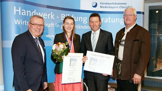 Bild v. links: Jürgen Kilger, stellv. Hauptgeschäftsführer Handwerkskammer, Drexler Simone, Norbert Peter, Prokurist Firma Bachl, Richard Hettmann, Vizepräsident der Handwerkskammer.