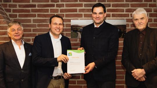 Landrat Sebastian Gruber (2.v.r.) und der Röhrnbacher Bürgermeister Leo Meier (l.) überreichten die Teilnahmeurkunde am Klima + Umweltpakt Bayern an BACHL-Geschäftsführer Michael Küblbeck (2.v.l.) und an Beiratsvorsitzenden Karl Bachl (r.).