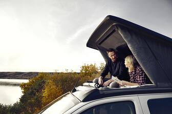 Das CROSSCAMP-Konzept fährt mit einigen Highlights auf: Aufstelldach, Schlafbank, Einbauschränke und Küchenzeile sind serienmäßig erhältlich, genauso wie die beiden um 180 Grad drehbaren Vordersitze, mit denen sich im CROSSCAMP eine gemütliche Vierer-Sitzgruppe arrangieren lässt.
