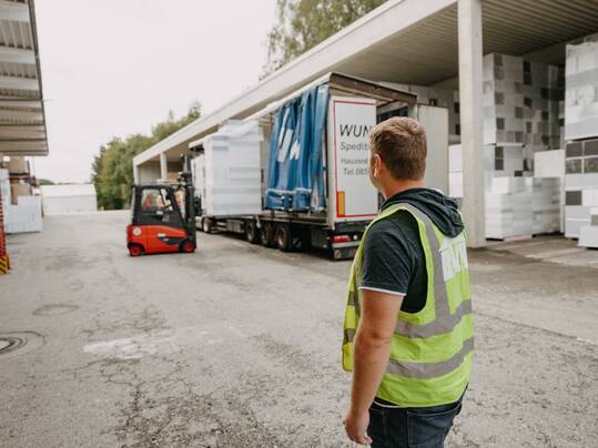 „Ich habe als Verlader, also Lagerist, angefangen und zwischenzeitlich die Vertretung unseres damaligen Leiters übernommen. Als dieser in Rente ging, hat es sich so ergeben, dass ich seinen Posten übernahm.“ Zu seinem Team zählen 20 Frauen und Männer, darunter auch zwei Azubis. „Das ist ein super Team, es macht Spaß mit ihnen gemeinsam zu arbeiten.“ Auf alle kann er sich zu 100 Prozent verlassen. Und das muss er auch, denn Planungssicherheit gibt es in seinem Job häufig nicht. „Die Fahrer können mit ihren Lkws beispielsweise im Stau stehen, wodurch auch bei uns der Verkehr ins Stocken gerät.“ Deshalb arbeiten die Verlader auch in zwei Schichten: Eine fängt gegen vier Uhr morgens an, je nach dem wann das erste Fahrzeug beladen werden muss. „Das sind häufig Baustellenfahrzeuge.“ Zwischen zehn und zwölf Uhr fangen dann die Verlader der zweiten Schicht an. Sie arbeiten „open end“, also bis der letzte Lkw vom Hof gefahren ist. „Durchschnittlich 40 Lkw werden derzeit bei uns ent- und beladen.“ Aber: Laut dem 33-Jährigen ist es über den Winter immer ruhiger, genauso wie in Ferienzeiten. „Im Frühjahr und in den Herbstmonaten ist ein deutlicher Aufschwung der Aufträge zu erkennen.“